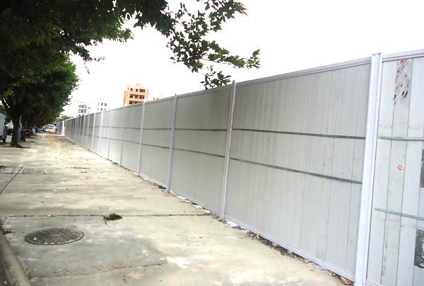 施工圍擋用白色彩鋼板作墻體,用藍(lán)色雙拼C型鋼作立柱,立柱頂部配藍(lán)色造型端蓋(可裝路燈),圍墻四周用藍(lán)色彩鋼框邊。高矮、大小、色澤一致。臟污后隨時可用水清洗擦拭。
